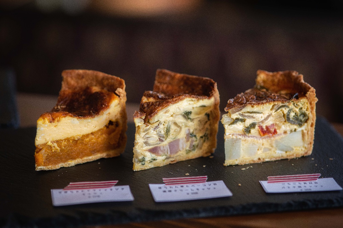 常時5~6種類のキッシュが用意され、席やテイクアウトの予約も可能(前日の昼まで)。人気は、「ほうれん草とベーコンの濃厚クリームキッシュ」や「ゴロゴロ具材のバスク風キッシュ」など。とにかく分厚くボリューミーなのが特徴で、一つひとつの具材の食感を楽しめるものや、細かく刻んだ具材同士のハーモニーを味わうものまでバラエティに富んでいる。