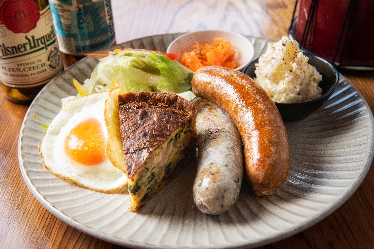 おまかせキッシュに、ハーブとチョリソーのソーセージも付いた、ボリュームのあるプレート。