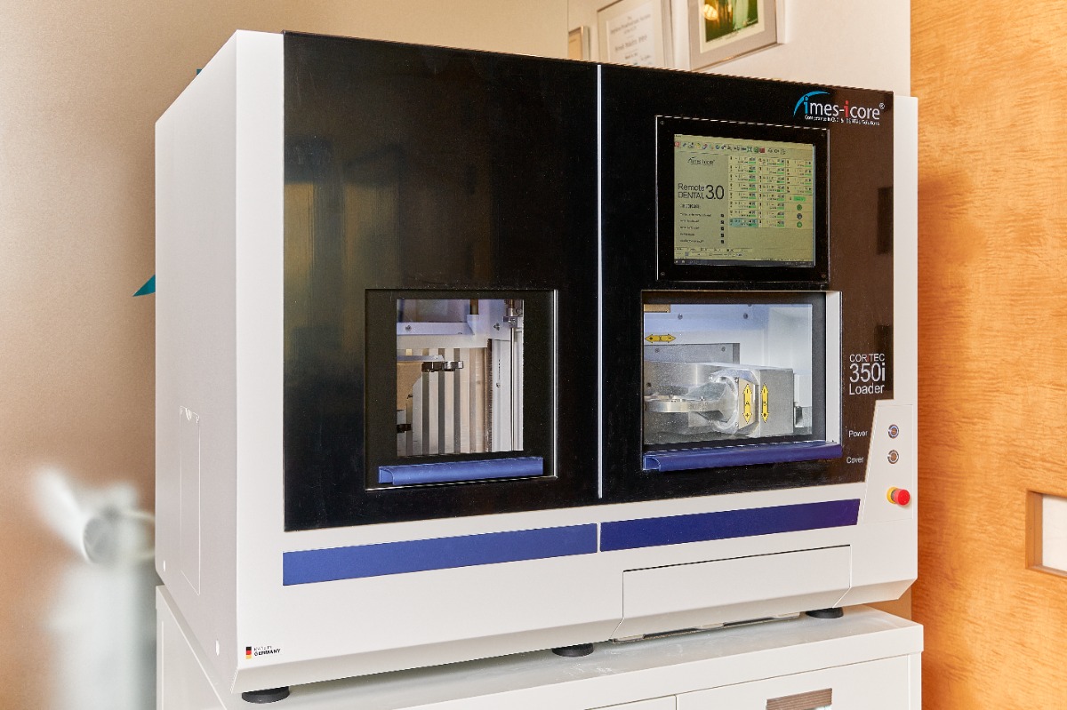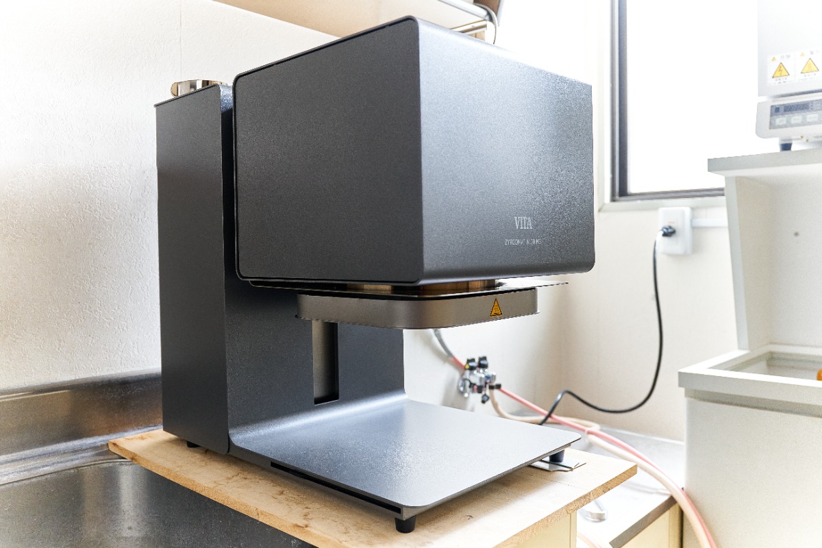 【中平】これは歯の詰め物、被せ物などを削るミリングマシンです。コンピュータで設計したデータを組み込み、自動加工します。補綴物の作成は在籍する歯科技工士と連携して行っています。