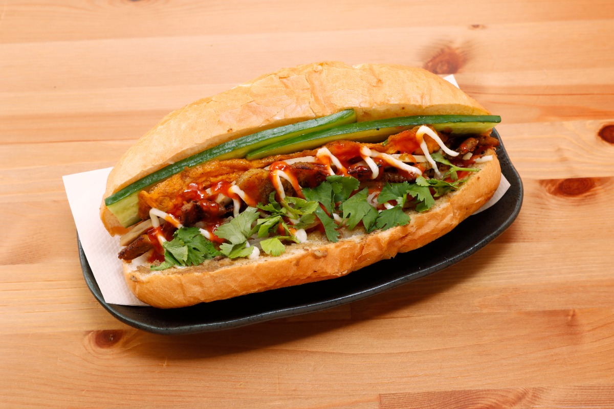 カリッと食感の「バン」に豚肉やベトナム産のハム、卵焼きなどを挟んだサンドイッチ。