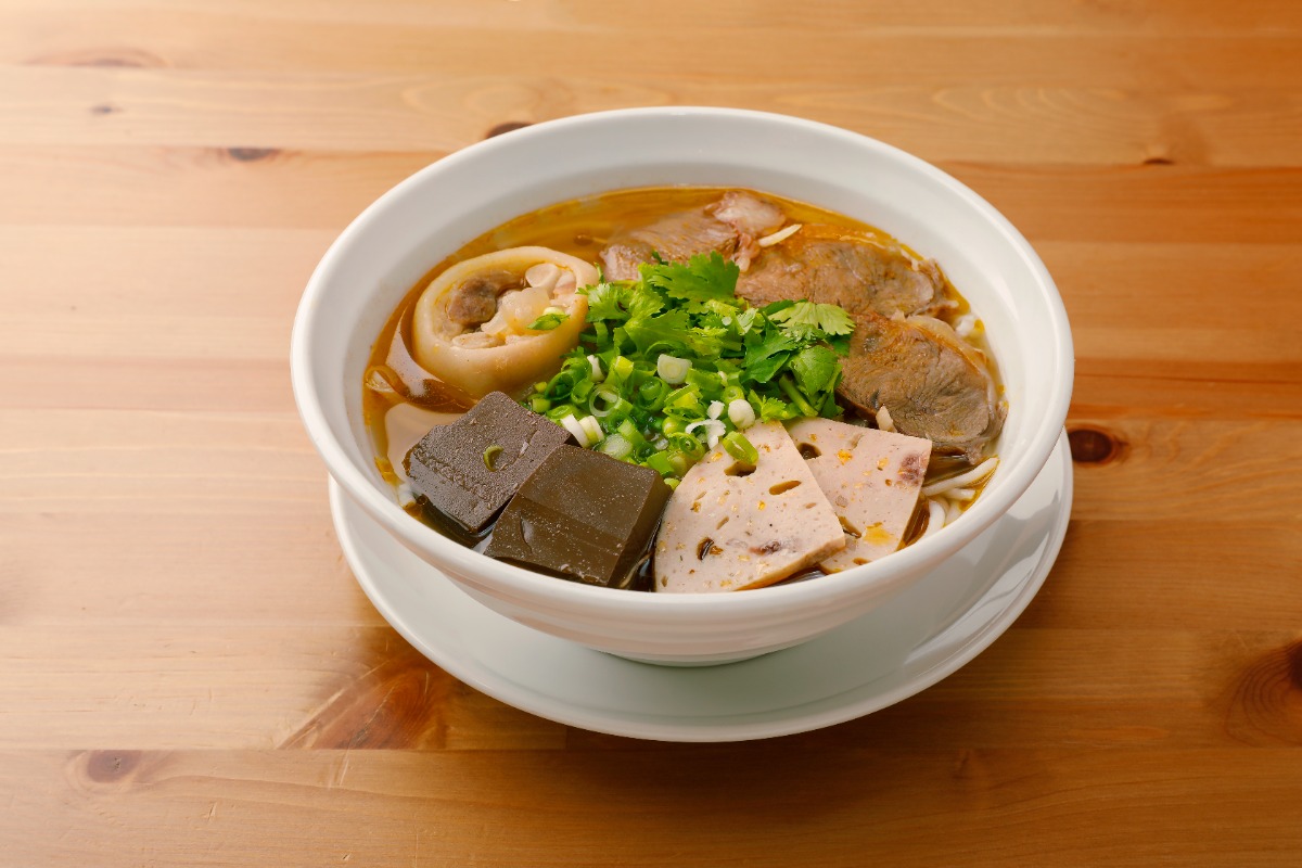 固めの中太麺「ブン」にベトナム産のハムなどが入った、牛のスープが食欲そそる「ブン」メニュー。