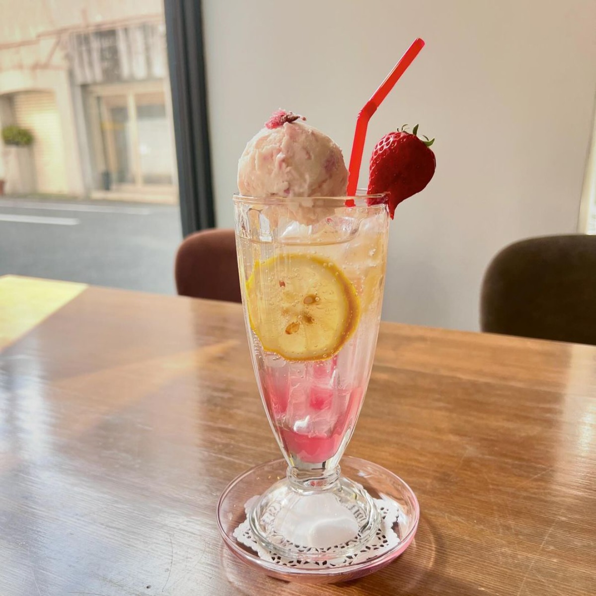 桜シロップとシロップ漬けしたレモンが入ったクリームソーダ。