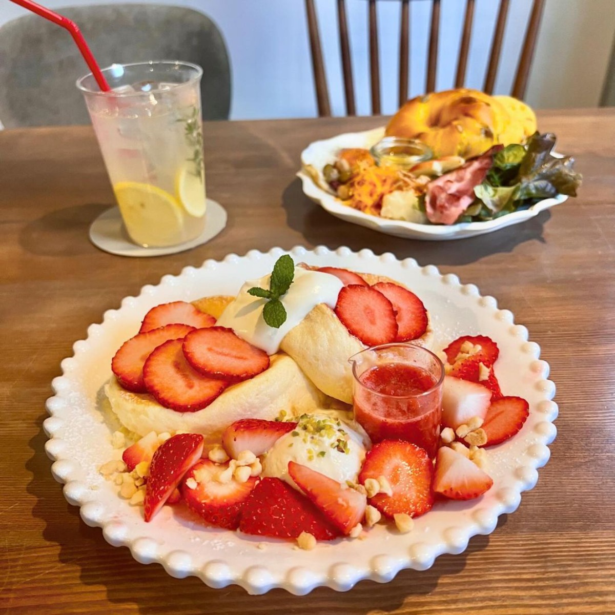愛媛県産のいちごを使用したパンケーキは、THEいちご、いちごとキャラメリゼバナナ、いちごティラミスの3種類がのっています!