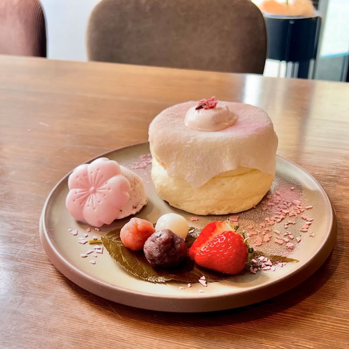 パンケーキの上にもちもちの求肥や桜クリーム、桜花の塩漬けがのったパンケーキ。