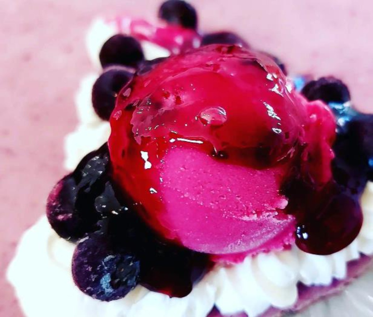 「推し活クレープ 紫」(550円):紫芋の生地に、中は、カシスの果肉、カシスソース、カシス果肉入りアイス、生クリームが入り、甘酸っぱい味がクセになる!