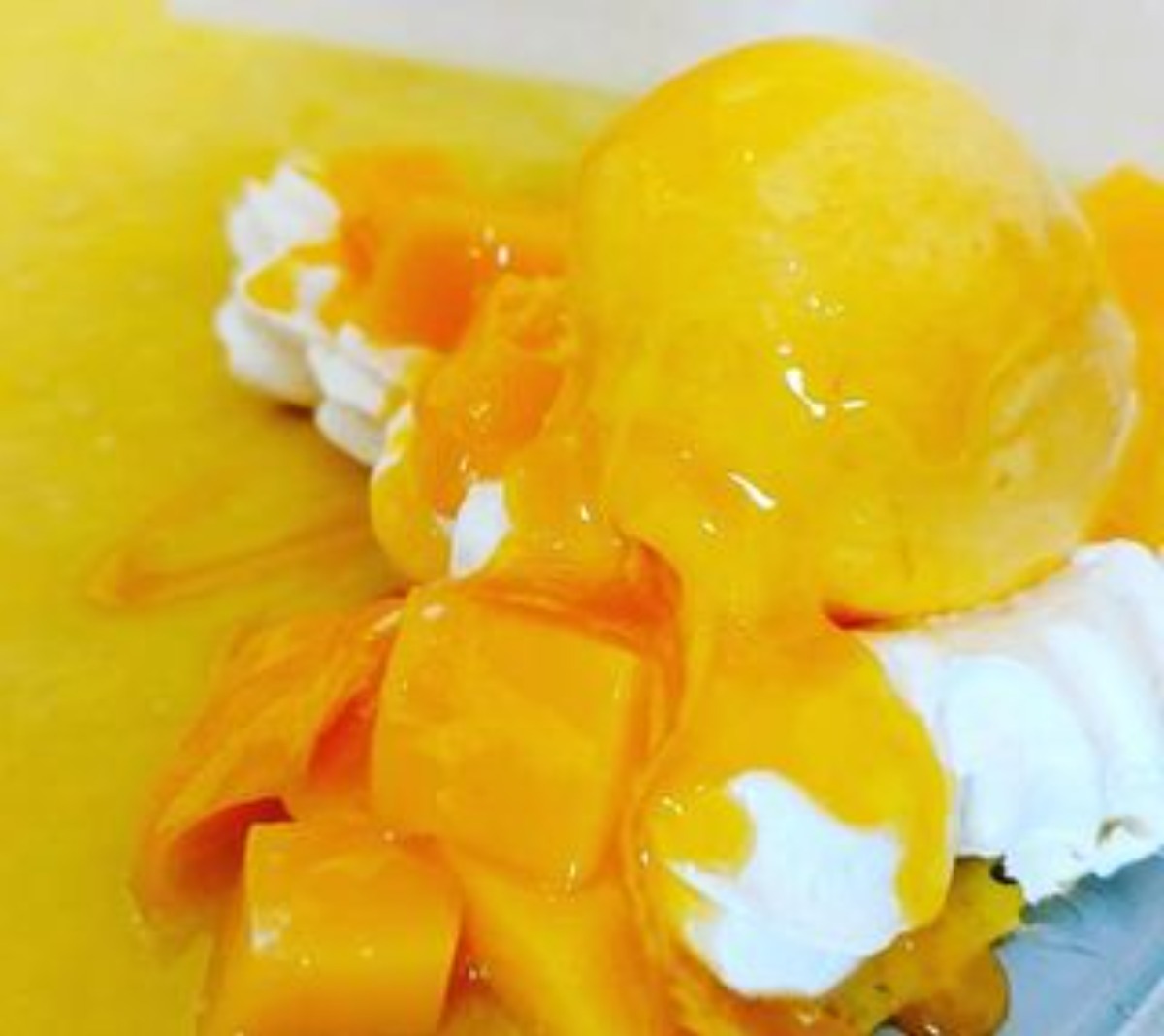 「推し活クレープ 黄」(550円):マンゴーの生地に、中は、マンゴーの果肉、マンゴーソース、マンゴー果肉入りアイス、生クリームが入り、程よい甘さが特徴。