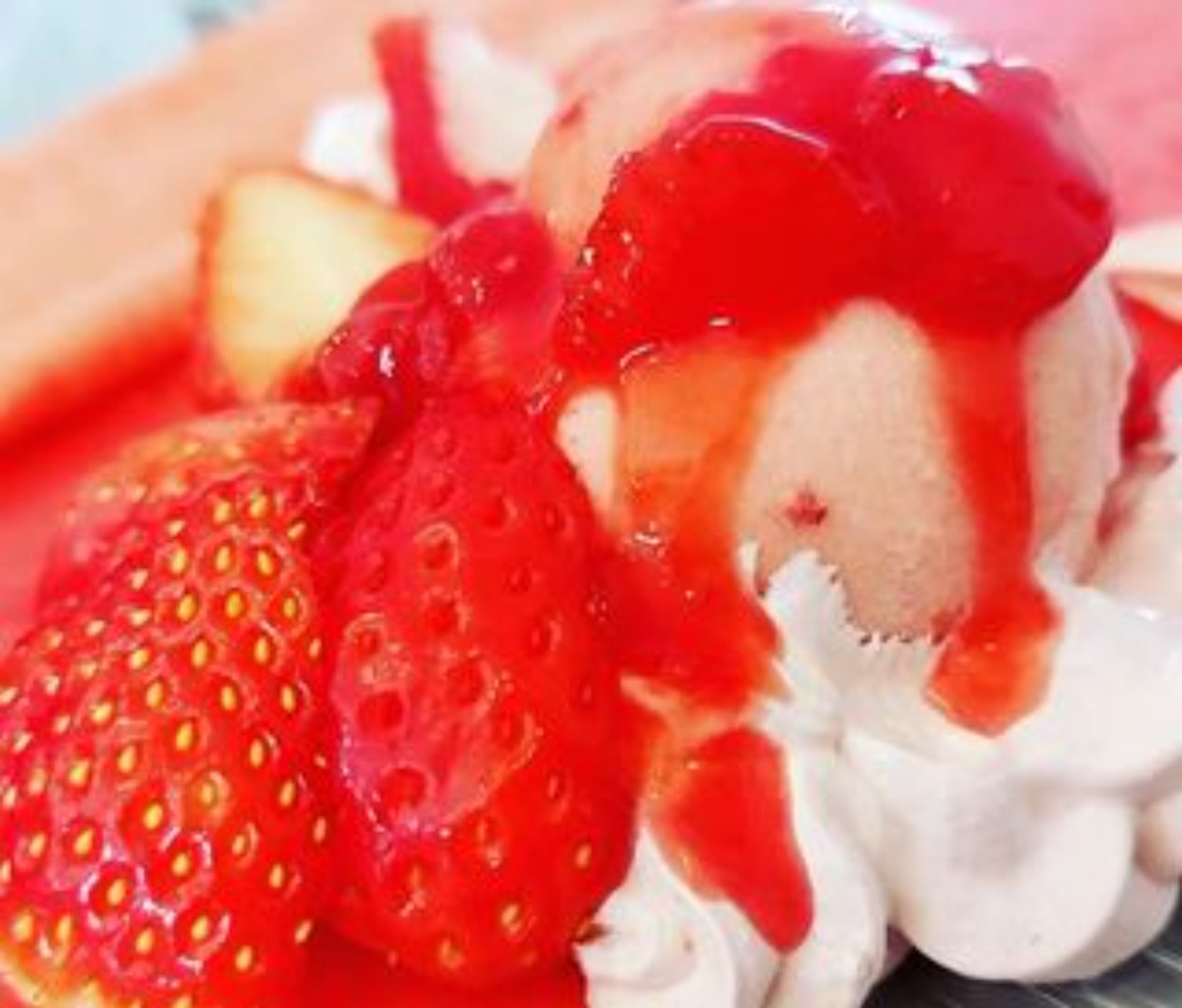 「推し活クレープ 赤」(700円):イチゴの生地に、中は、イチゴ、イチゴ果肉入りアイス、果肉入りイチゴソース、イチゴクリームと、イチゴ三昧!