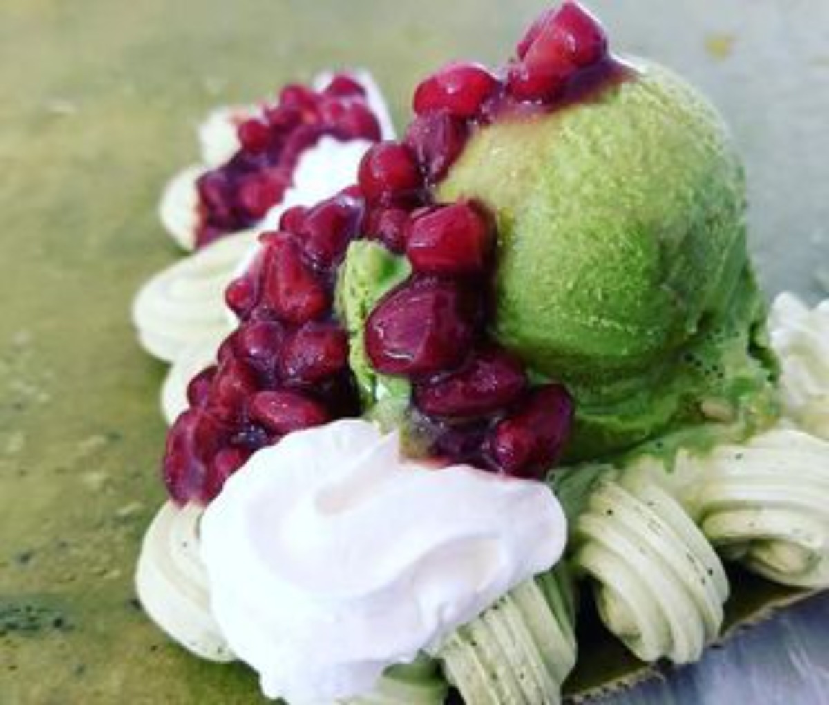 「推し活クレープ 緑」(600円):抹茶の生地に、中は、抹茶アイス、抹茶クリーム、生クリーム、小豆がイン。大人の味を召し上がれ。