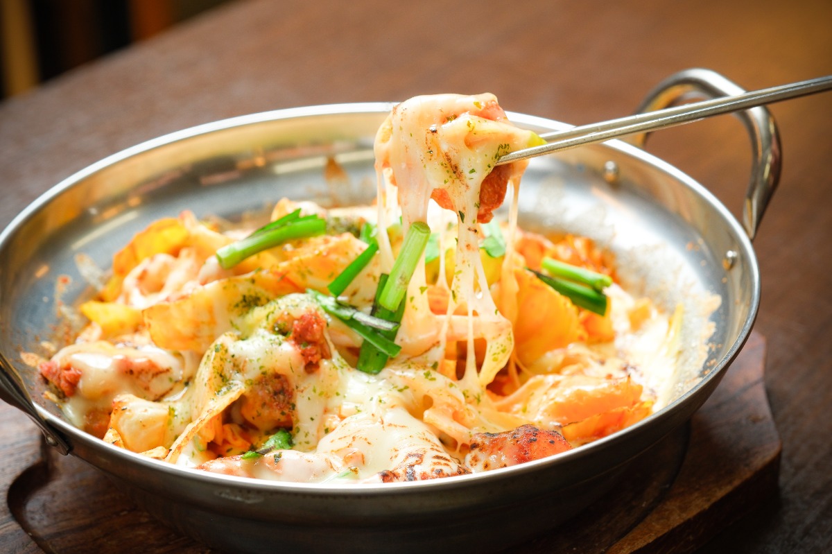 自家製の甘辛ソースが鶏肉と野菜に良く絡み、たっぷりのったチーズが魅力のタッカルビ。
