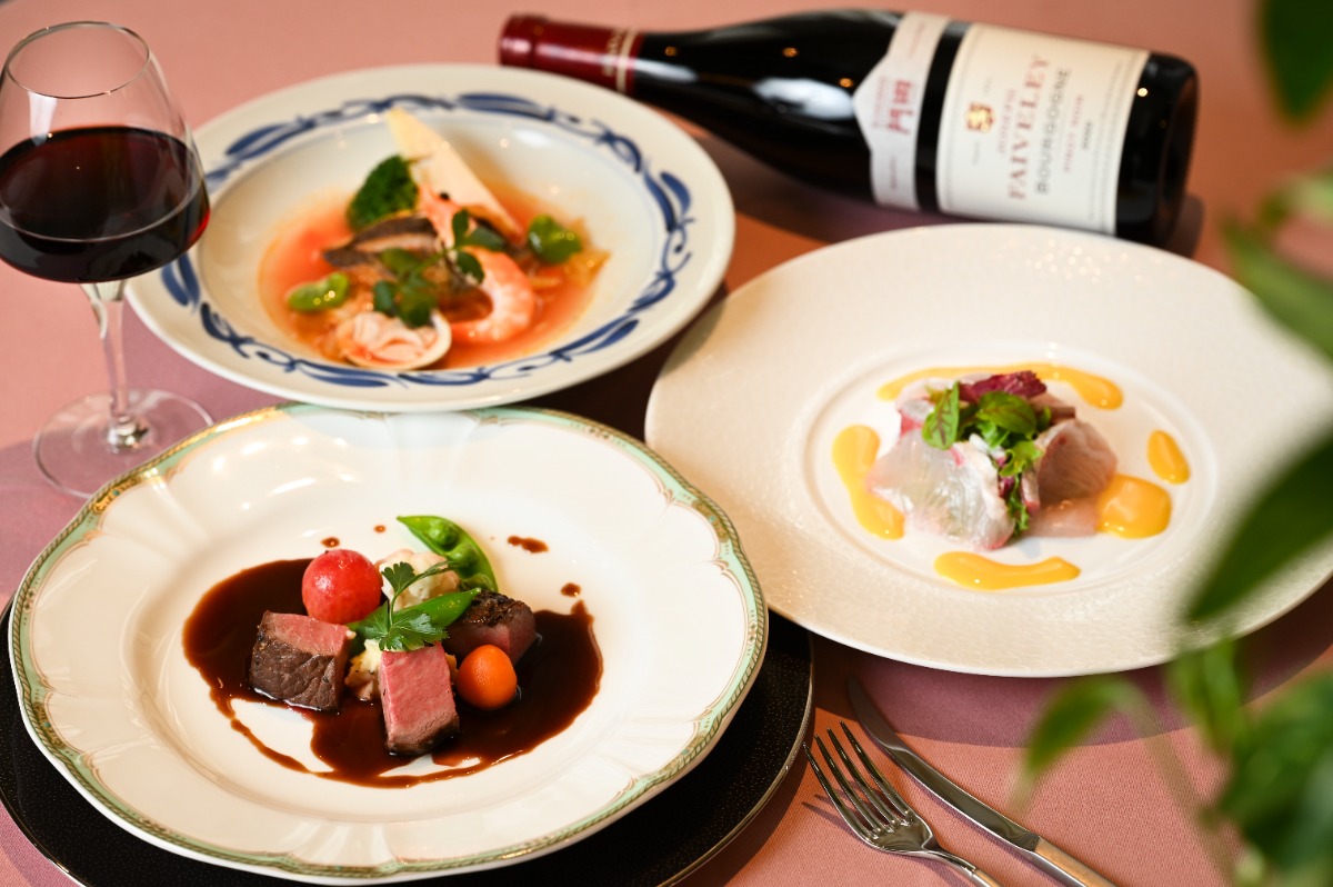写真は、冷前菜「カンパチのクリュ サラダ仕立て みかんソース」、魚料理「イサキと初夏の野菜のスープドポワソン」、肉料理「牛ヒレ肉のロティ 赤ワインソース」の3品。