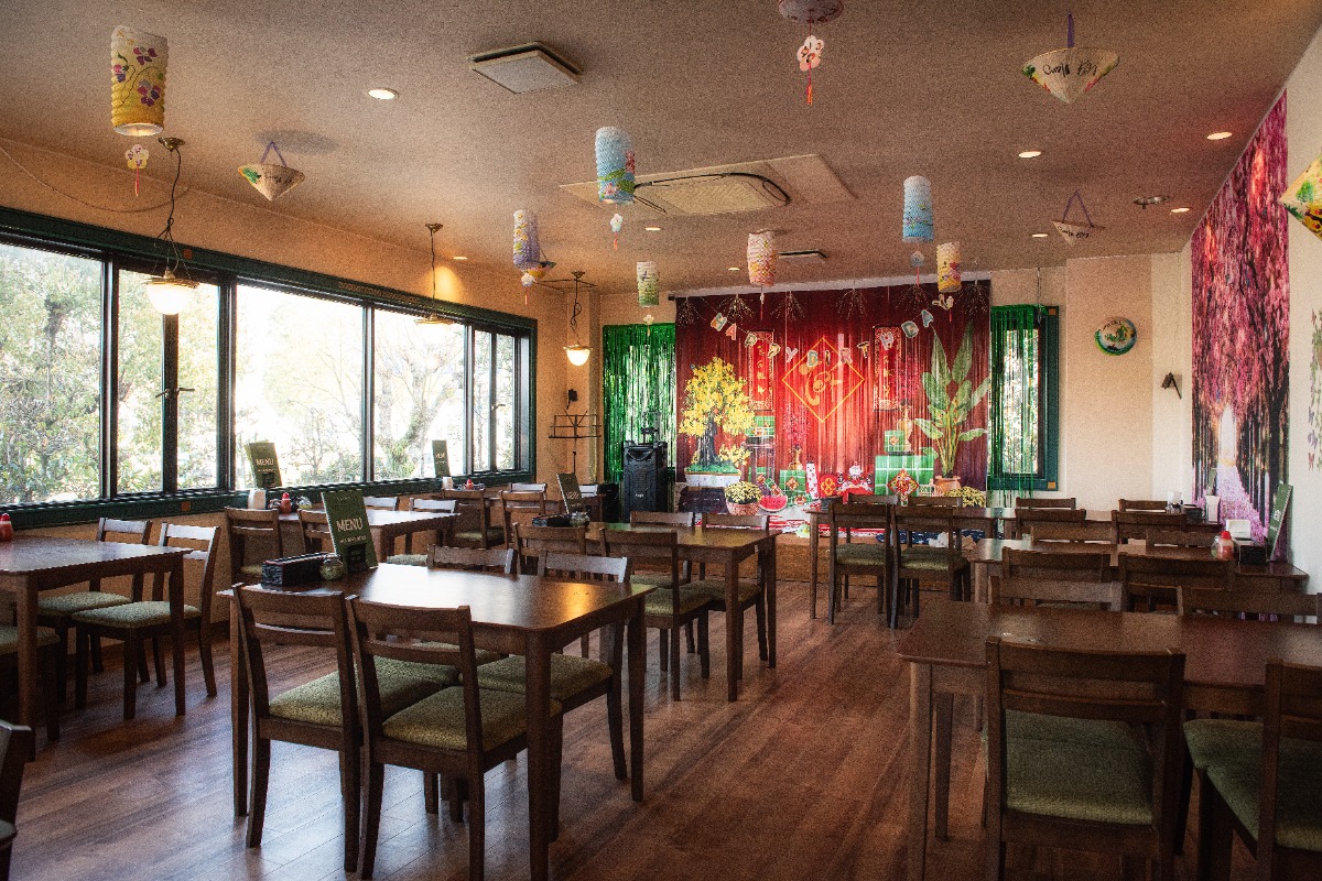 建物の2階部分がレストランになっています。ベトナムの提灯や花傘、ポスターなどが飾られた広々とした店内は貸し切りパーティなども可能。本場ベトナムの情緒を感じられます。