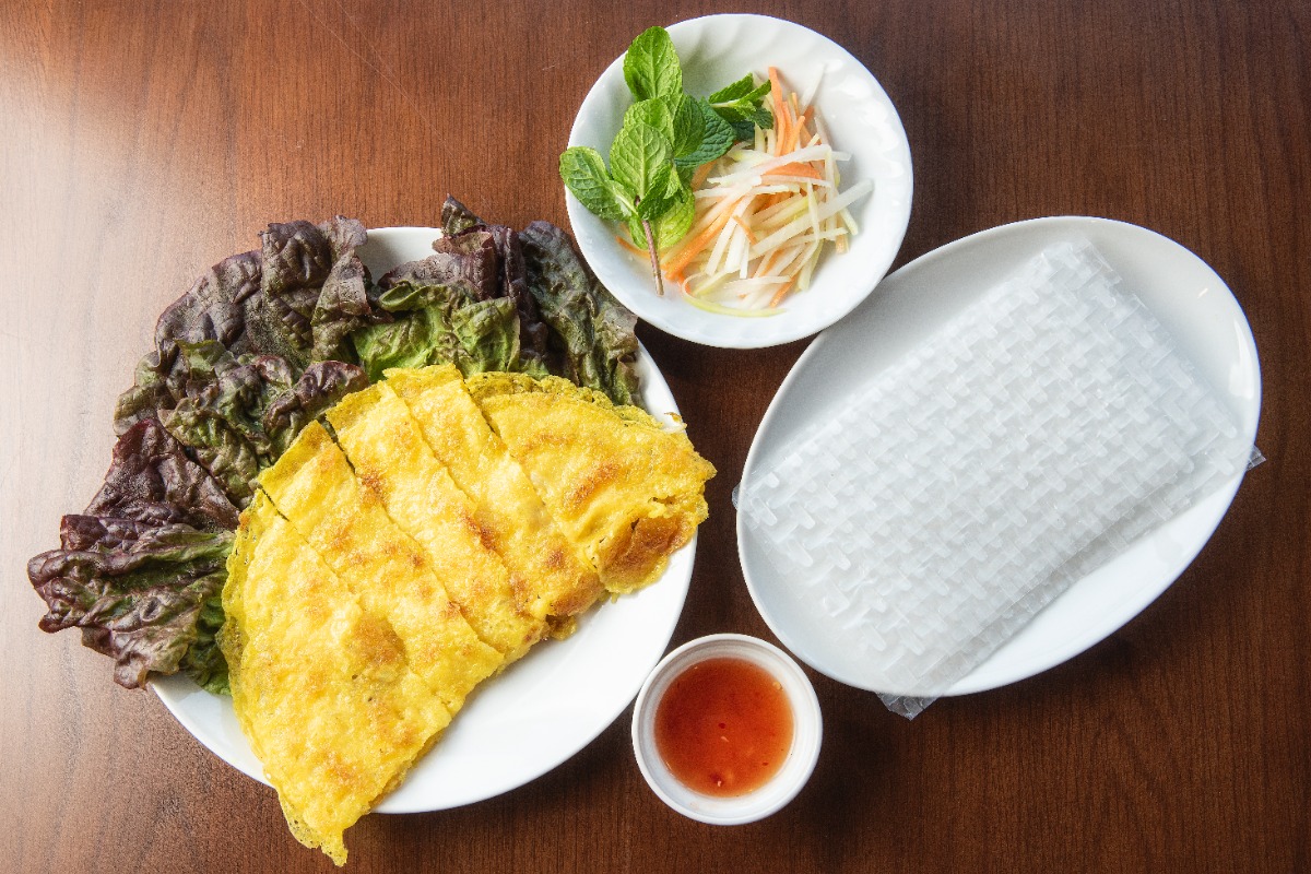 「ベトナム風お好み焼き」といわれている「バインセオ」。ライスペーパーの上に米粉の生地、野菜とミントをのせ、タレをつけて食べる一品!