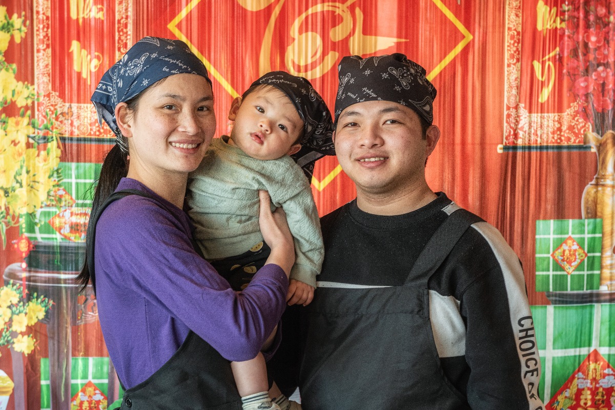 出迎えてくれたのは、ベトナム人のご夫妻。左から店長・トラン テイ マイさん、息子・トラン ジャ バオさん、シェフ・トラン ドック クンさんです。