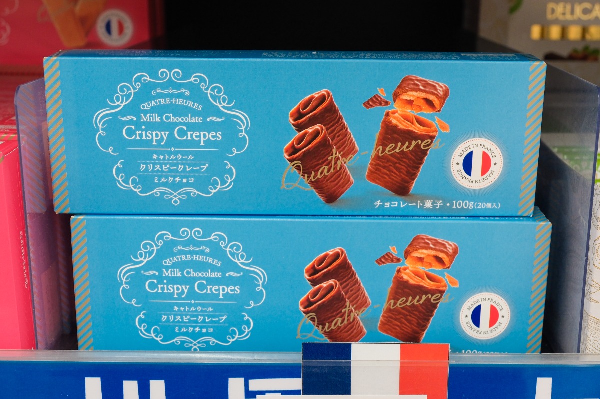 薄く伸ばしたクレープ生地を一口サイズに重ね合わせ、ミルクチョコレートでコーティングしたクリスピークレープ。