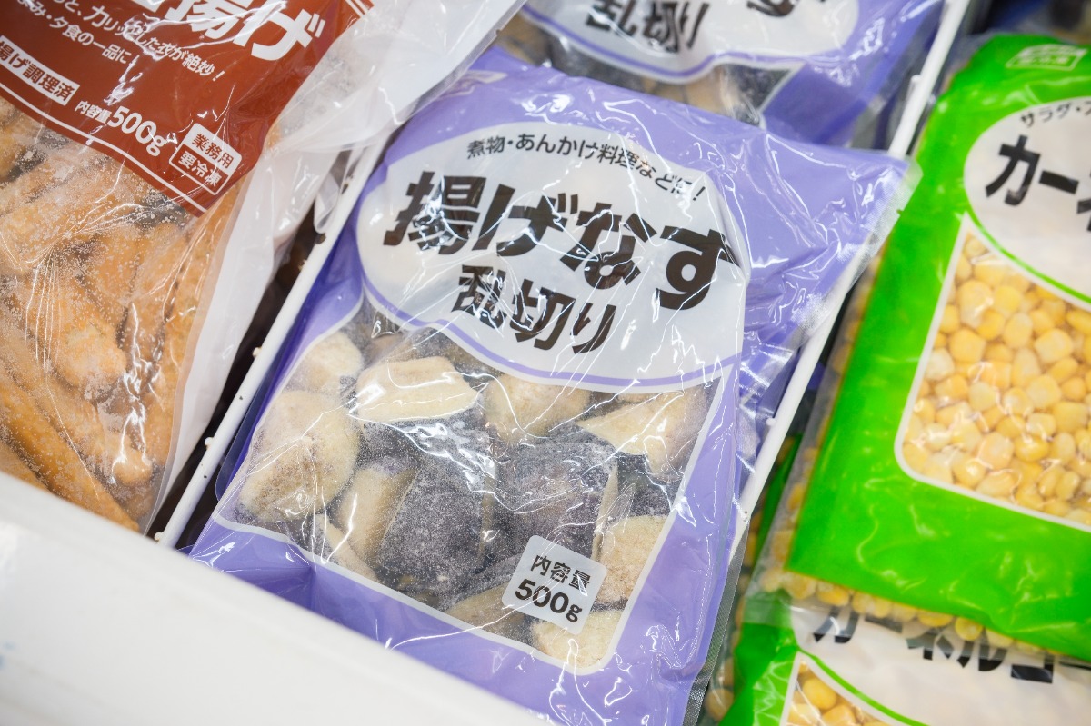 ナスを乱切りにした後、油で揚げて急速冷凍しました。