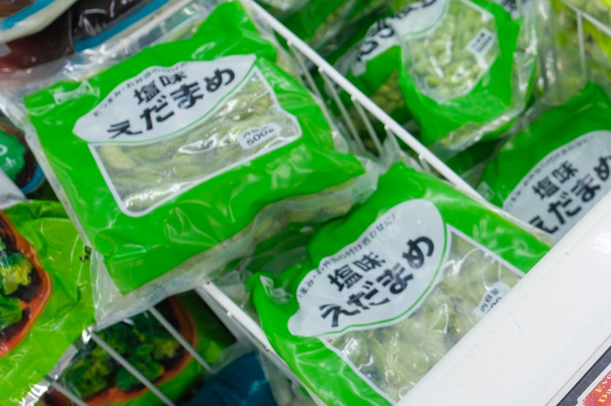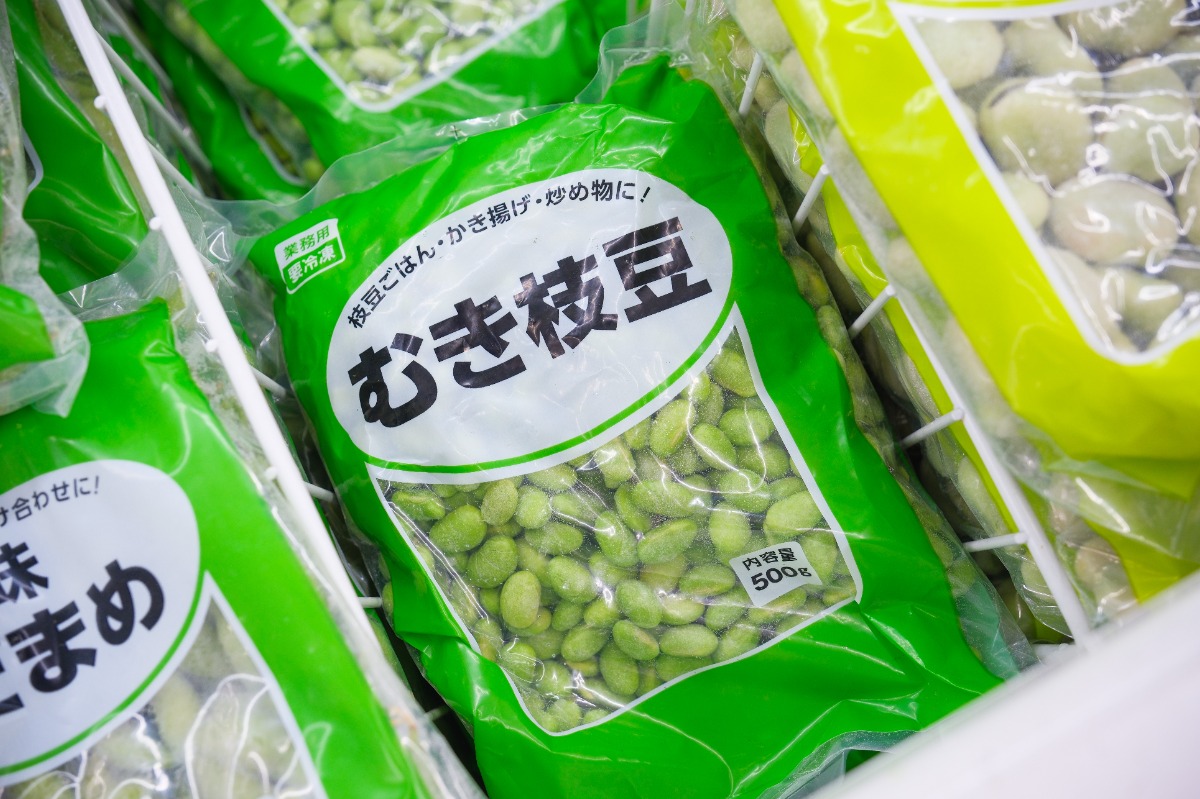 厳選したエダマメのさやから実を取り出し、軽く湯通ししてから急速冷凍しています。