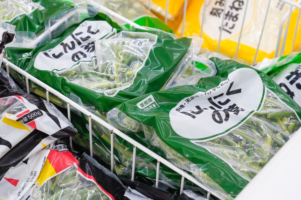 香りの良いニンニクの芽を食べやすい大きさにカットし、軽く湯通しして急速冷凍しました。