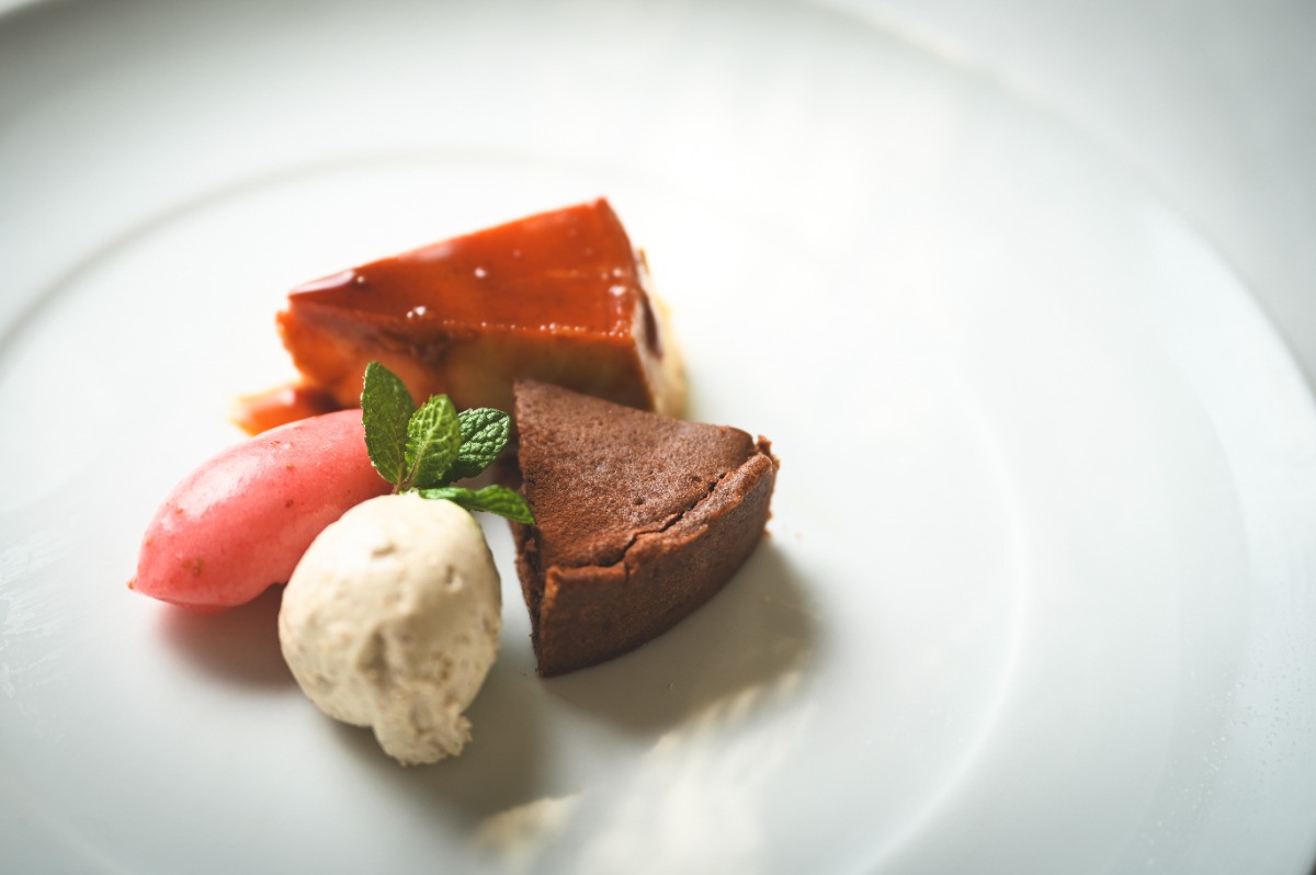 デザートは、タルトやムース、プリン、シャーベットなどプティフール約4種のワンプレートです。