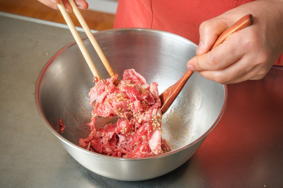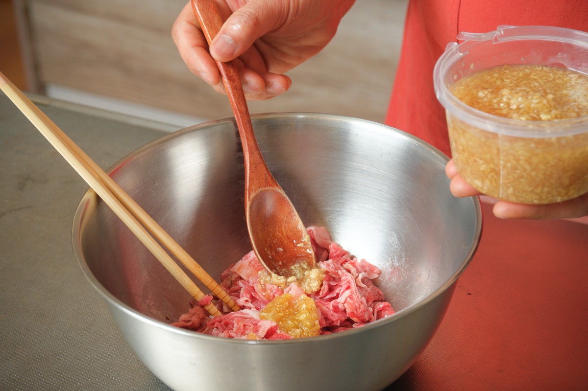 牛肉300gに【B】(ニンニク、生姜、醤油、ゴマ油、砂糖、塩、こしょう)をしっかりとなじませます。