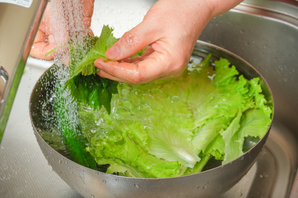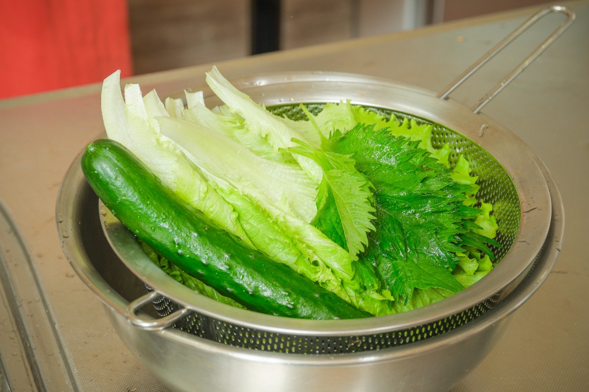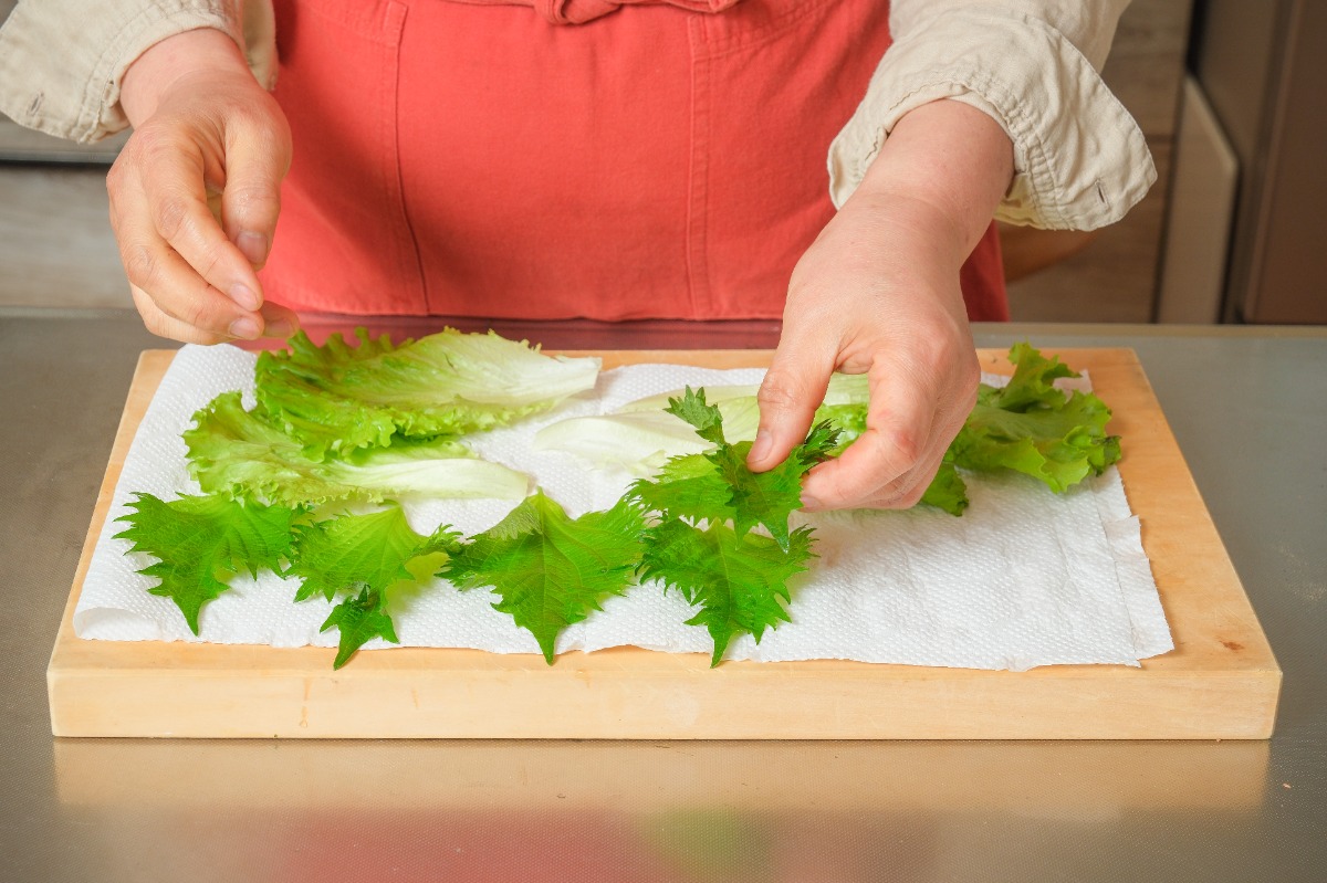 今回はお肉に合うようにさっぱりとした野菜、サニーレタス、大葉、きゅうりを一緒に巻きます。