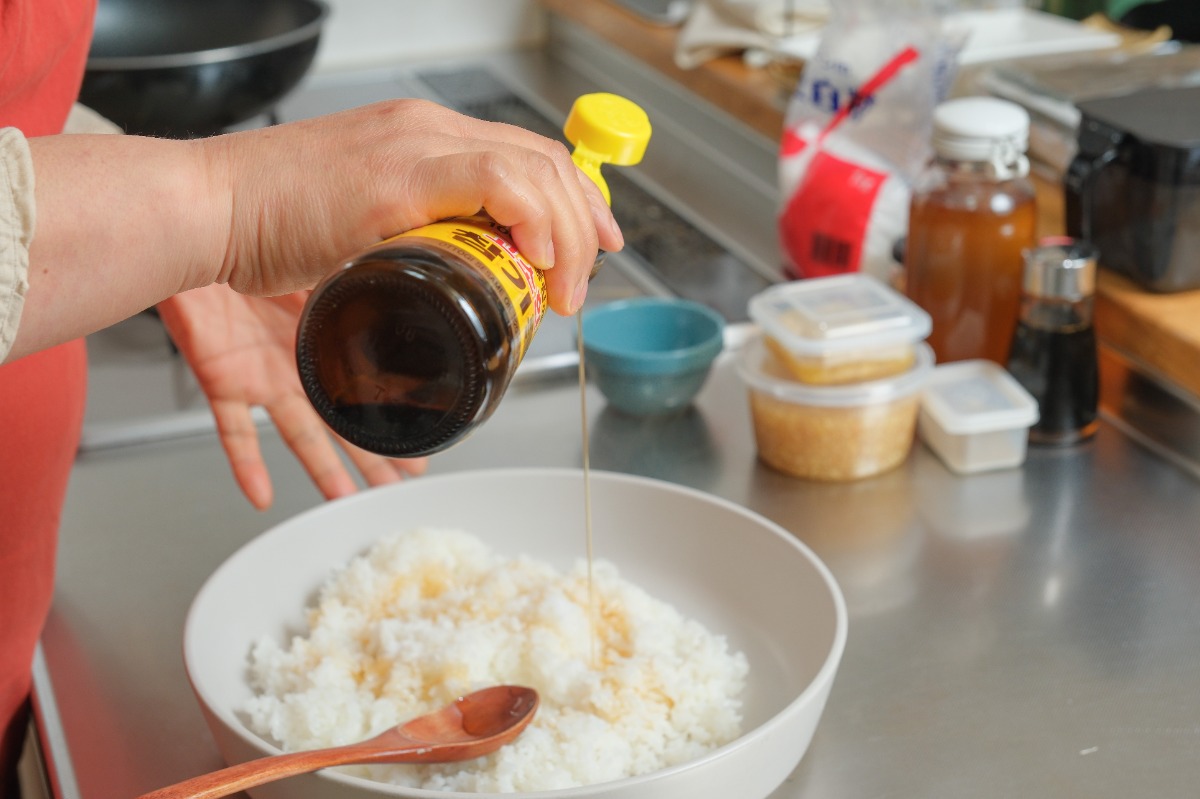 ごはんに【A】(ゴマ油、砂糖、ごま、塩)を入れて混ぜ合わせます。