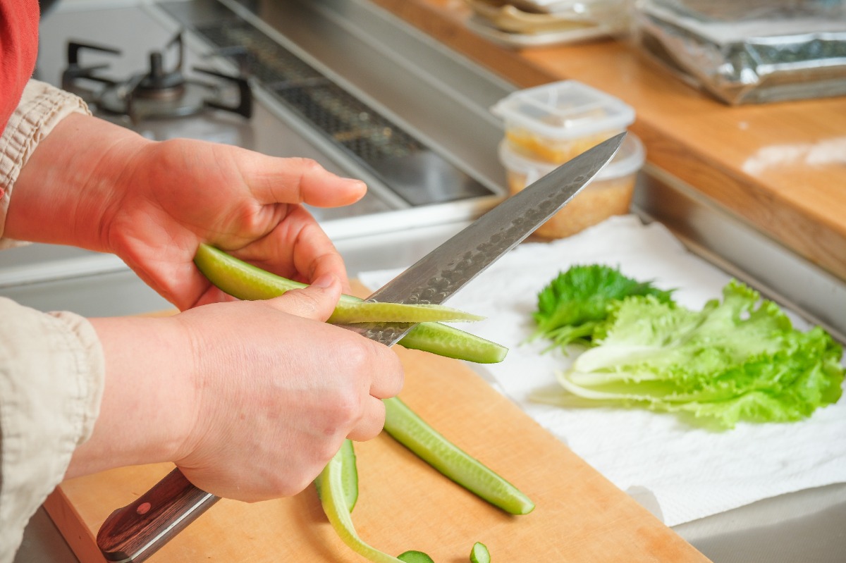 きゅうりの水分をとるため種の部分をカットして、細めに切るのが今回のポイントです。