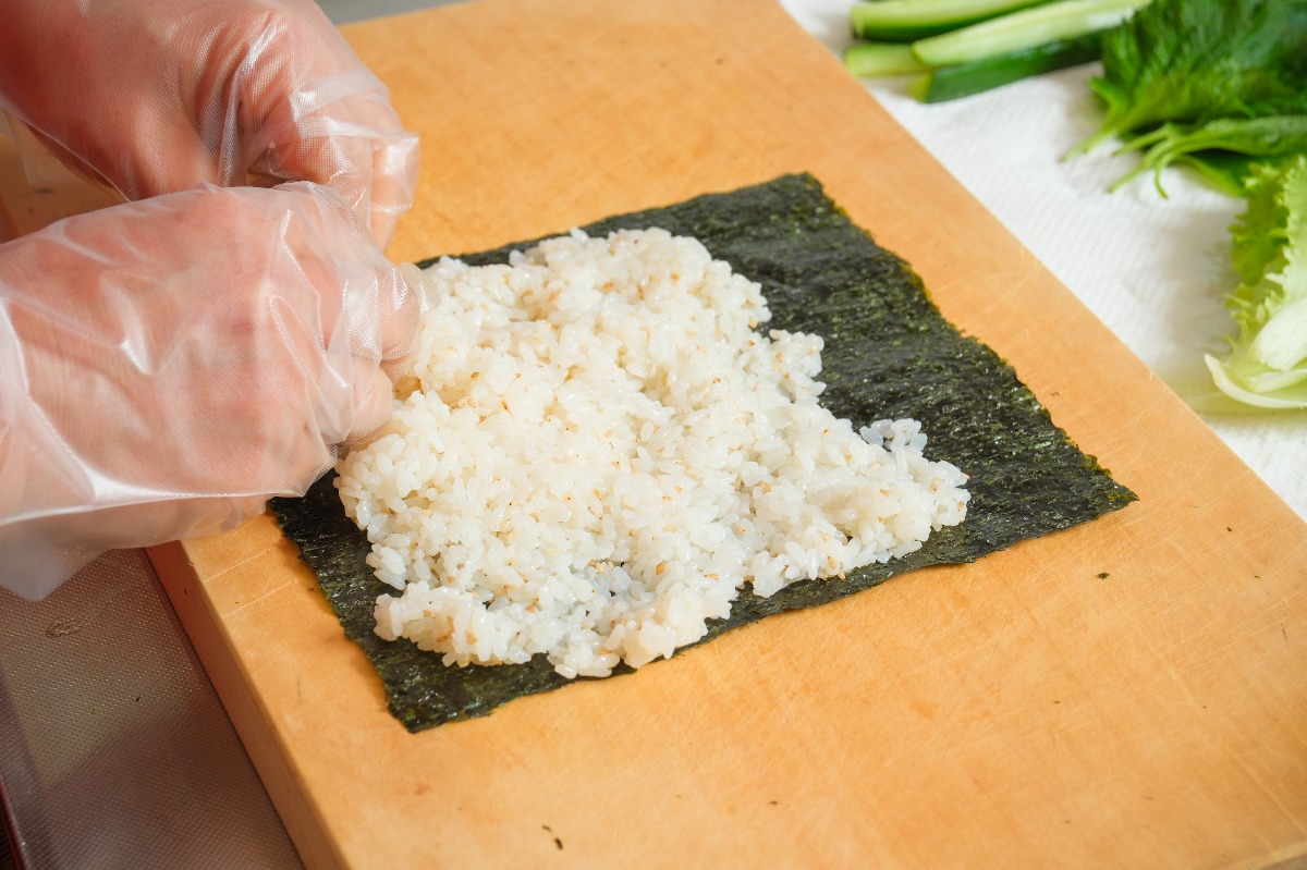 焼き海苔を縦に置いて、まずはシャリを敷きつめます。