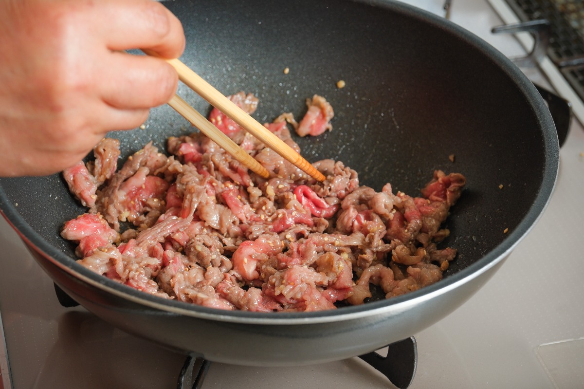熱したフライパンにゴマ油をひいて、下味をつけた牛肉を色が変わるまでしっかりと炒めます。