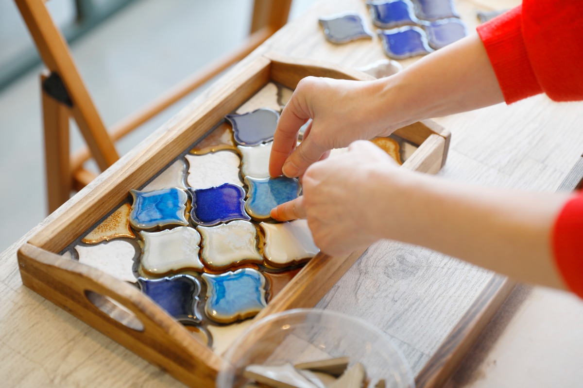 カフェトレイや植木鉢、座れるスツールなど様々な種類のタイルを組み合わせてお好みのタイル雑貨を作ることができるワークショップです。