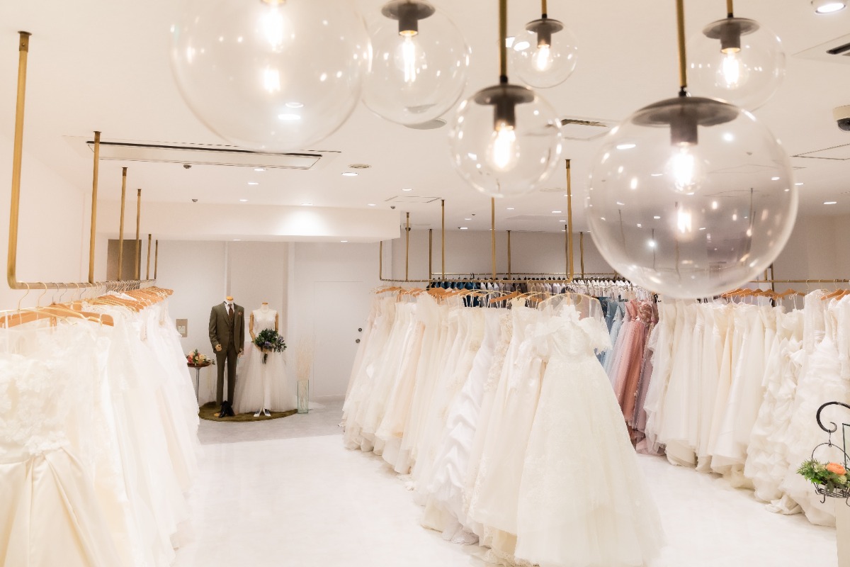 松山店には衣裳が豊富に揃っており、沖縄や海外での挙式の衣裳を松山で事前に決められるので安心!