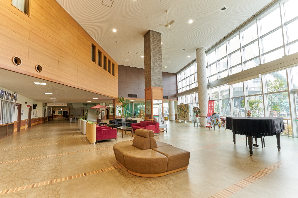 写真は「愛寿荘」のエントランス。暖かな光に包まれた開放的な空間は、交流スペースの役割も担っている