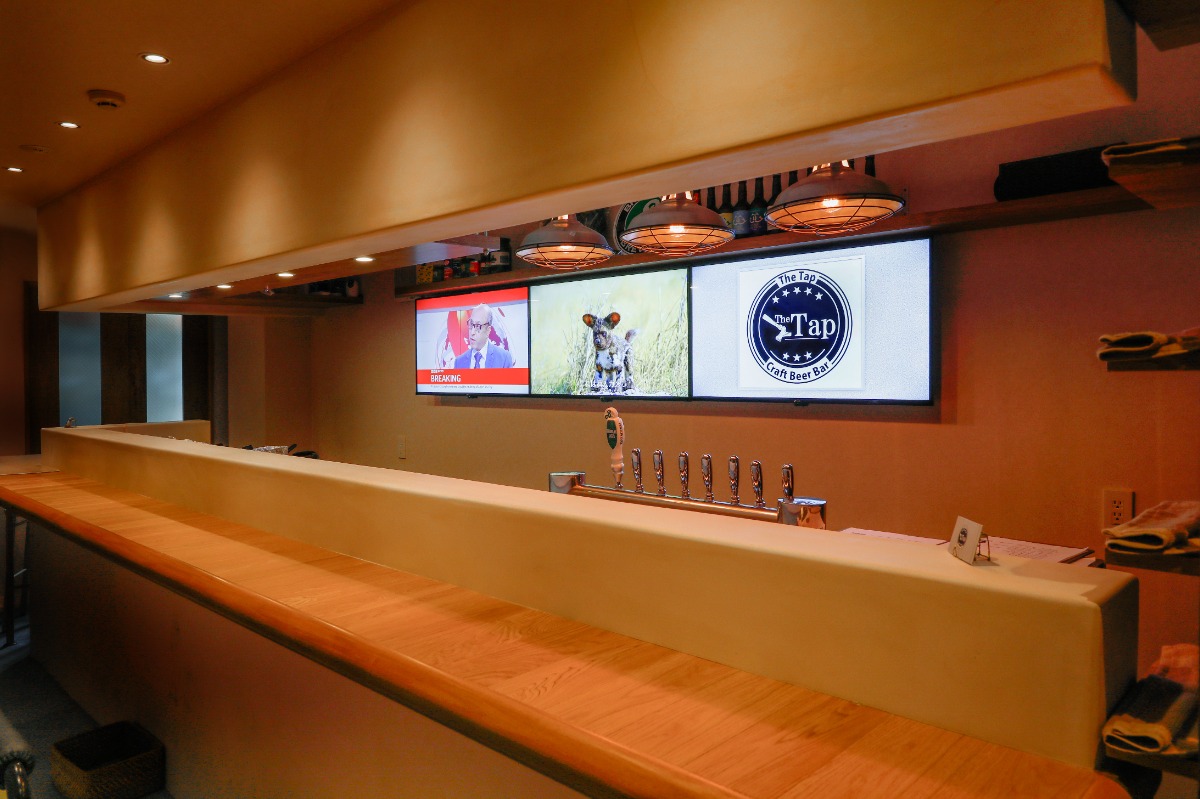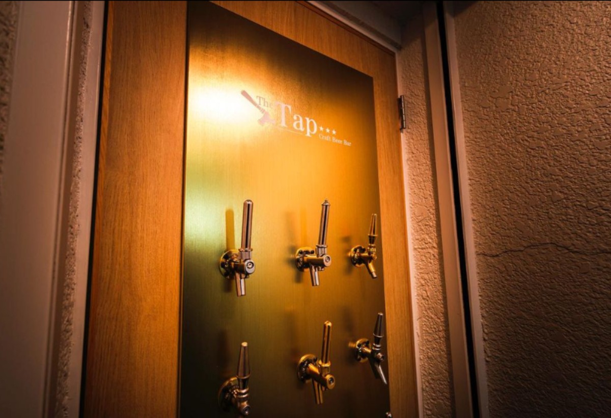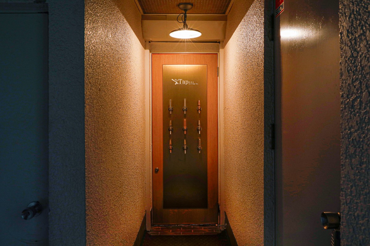 隠れ家的バー「ザ・タップ」。ビルに入って左に曲がると、なんと入口ドアに9つのタップが!