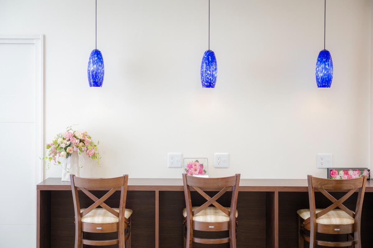 ▲ブルーの照明が美しいカウンター席は、コンセント完備で便利