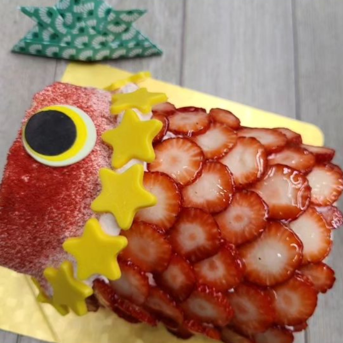 いちごと生クリームのロールケーキに、いちごウロコを飾ったボリュームたっぷりのケーキ。
