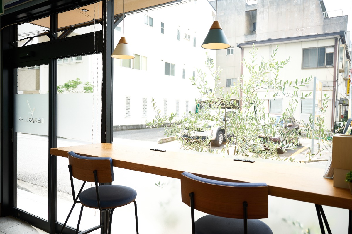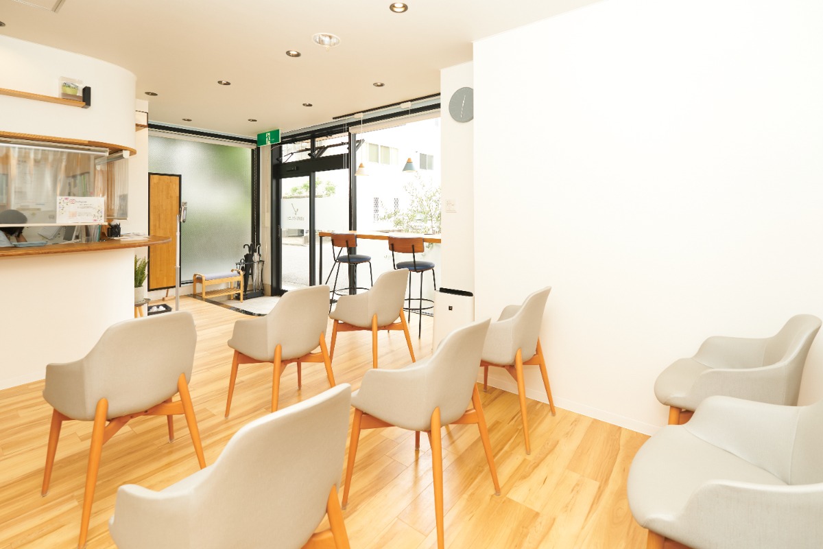 ▲明るい陽が差し込むカフェライクな待合室。心地よい音楽が流れる