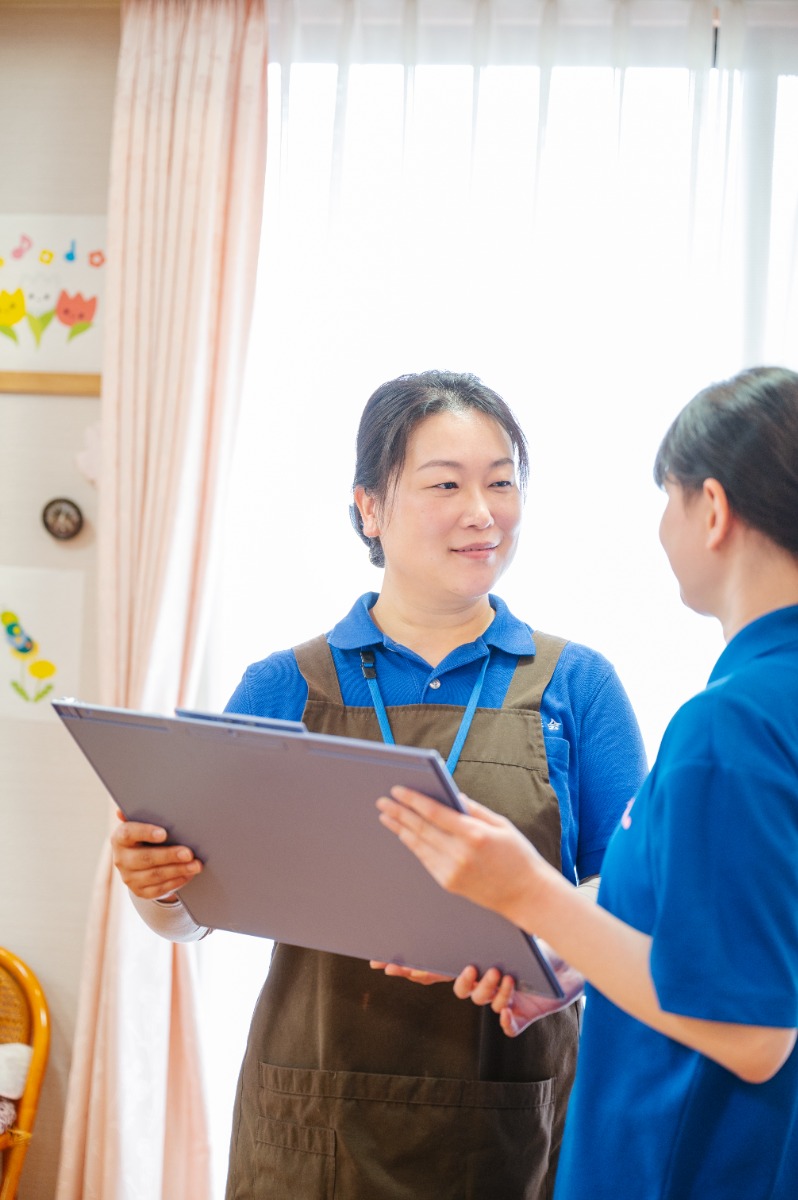 「利用者さんと接する時は、丁寧な言葉遣いと安全面に特に気を遣っています。移住してずいぶん経ちますが、まだまだ私の知らない昔の日本の話や、自分の子どもとも年齢の近い利用者さんのお孫さんの話を聞かせていただく時間がとても楽しくて」と笑顔を見せる劉さん。職員同士や利用者とのコミュニケーションも大事にしつつ、資格取得にも励んだりと充実した日々を送っている。