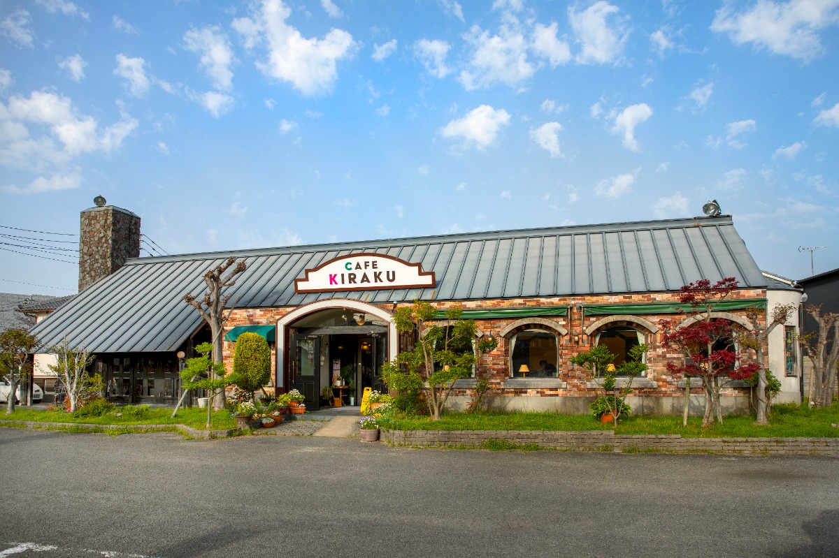 レンガ調の外壁と可愛い看板が素敵な「カフェ季楽」さん。