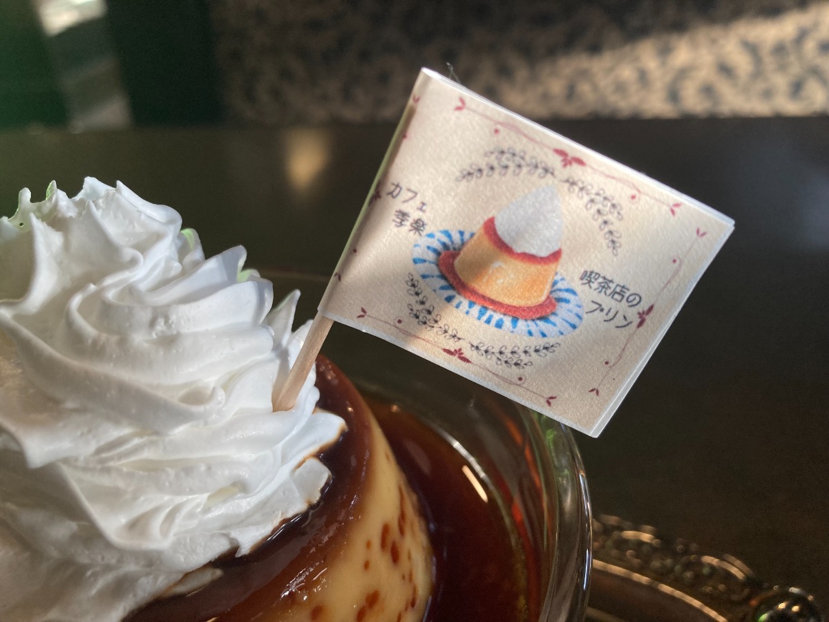 プリンについた旗をよく見ると、プリンの絵と一緒に「カフェ季楽 喫茶店のプリン」と書かれていました。