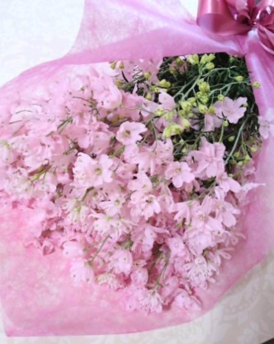 ふわふわピンクの花は桜のようで、毎年人気の花束です。