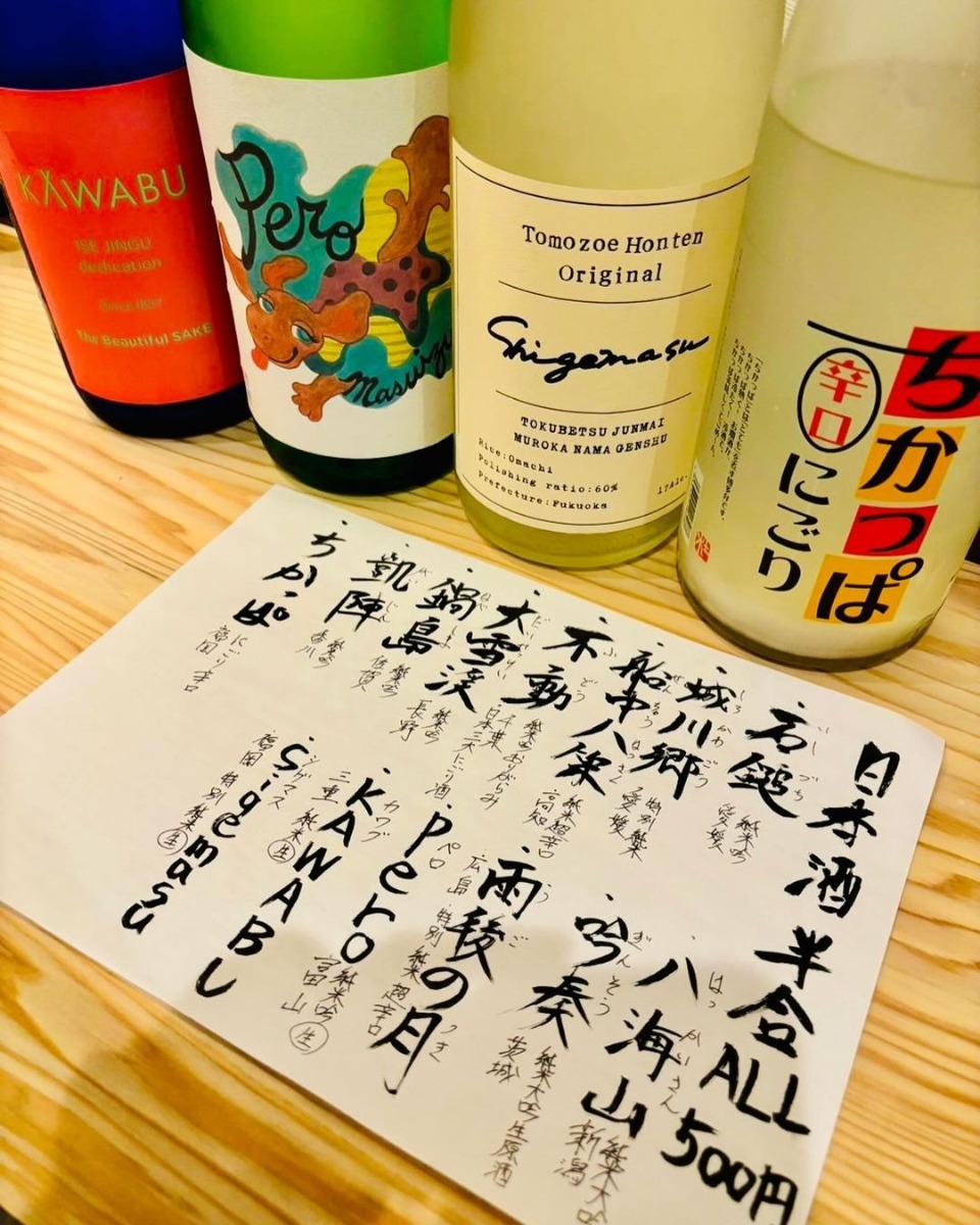 純米大吟醸など全国から選りすぐった20種類の日本酒を、どれもグラス半合で一律500円という手頃な価格で楽しむことができます。