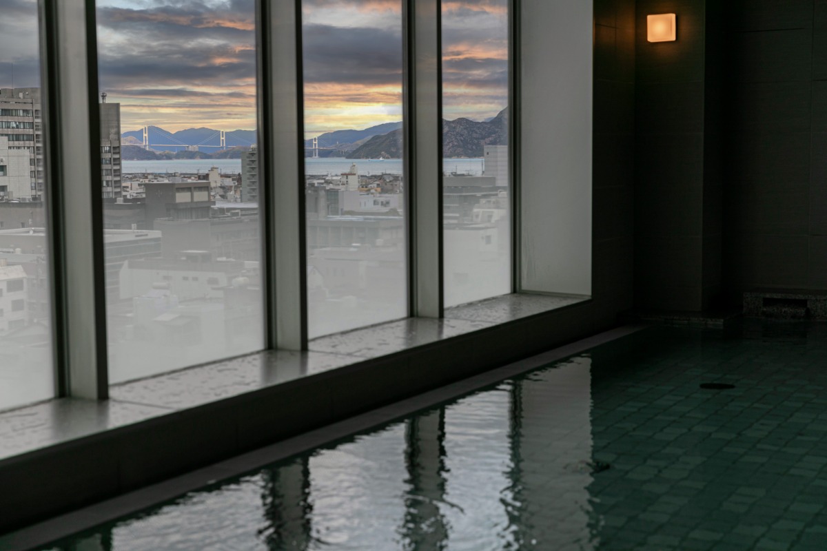「しまなみプライムホテル今治」の自慢の一つ、最上階にある展望大浴場からは、今治市街や美しい瀬戸内海が一望。