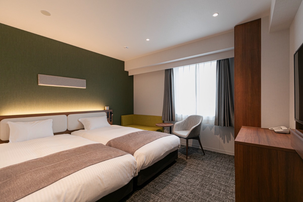 落ち着いた色合いとシンプルで広々としたデザインの客室。