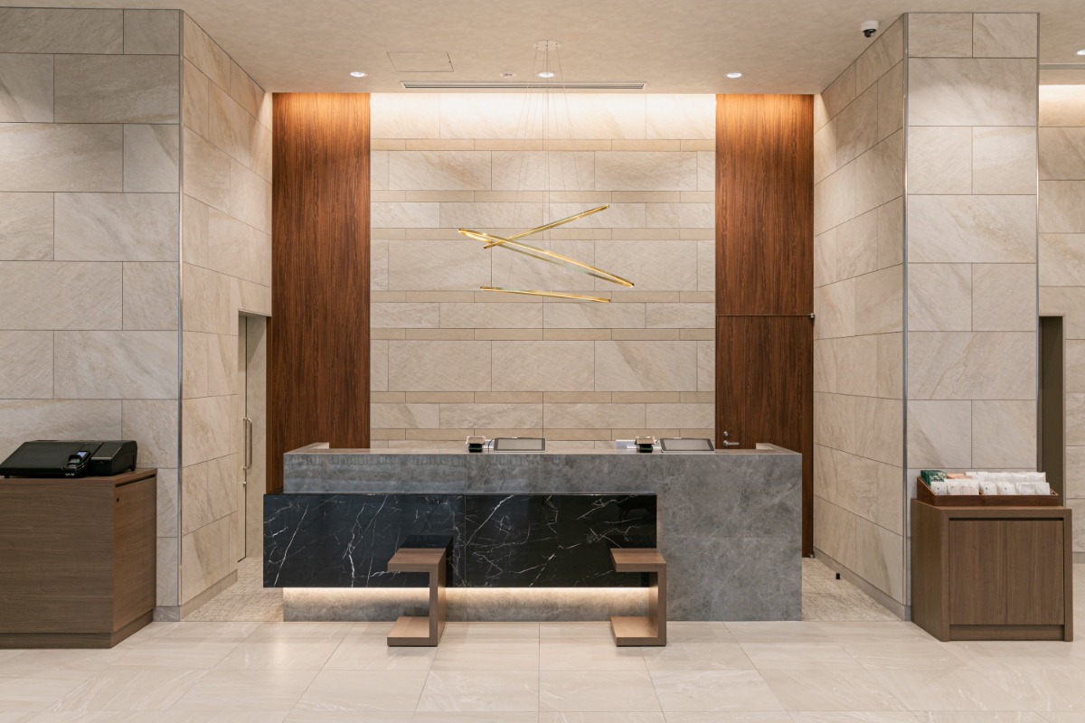 天井が高く広々とした空間のラウンジ。