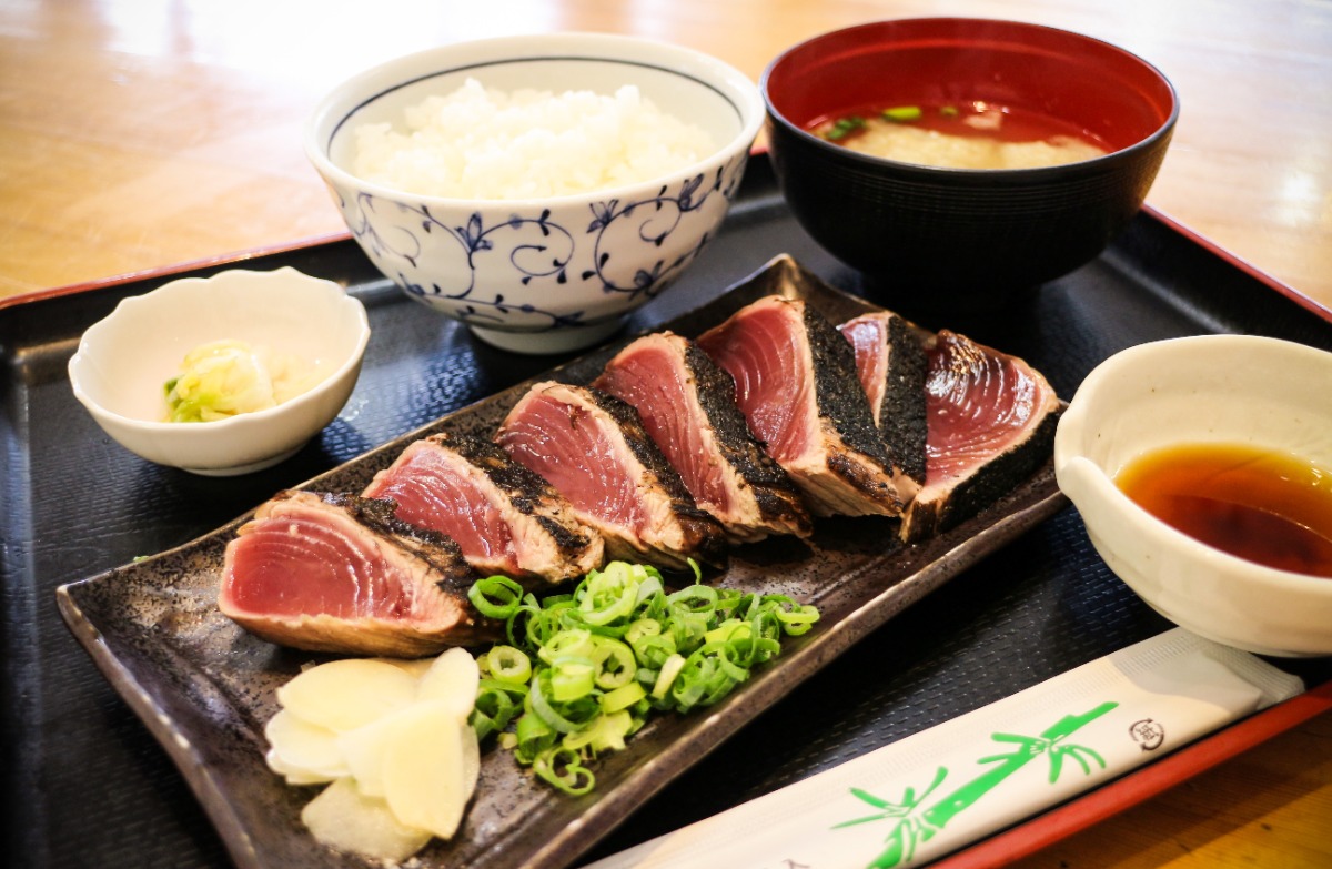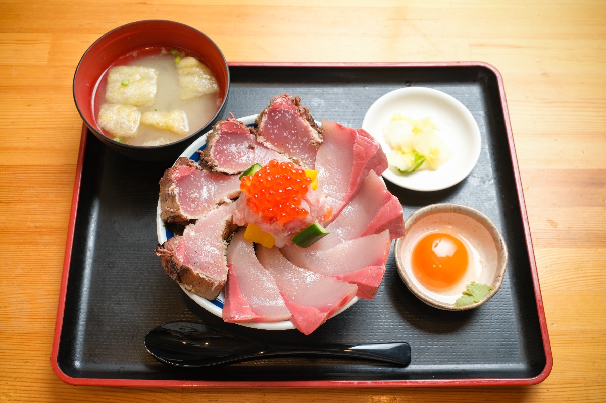 目の前で豪快に炙ってくれる「カツオのタタキ定食」。藁の香ばしい香りが食欲をそそる逸品です。塩味かポン酢味か選べますよ。「わら焼カツオのタタキ」は単品もあるので、丼を一人ひとり注文してタタキを単品で頼むのもおすすめです。