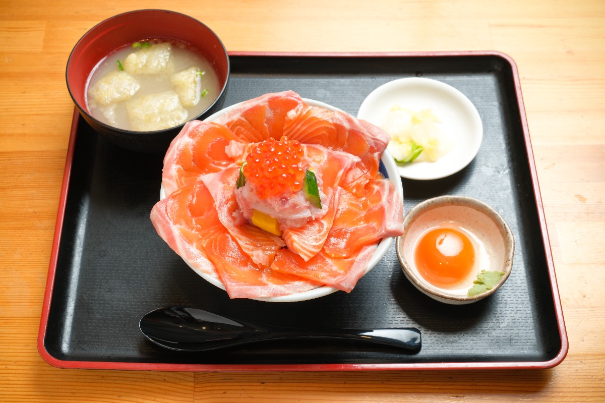 全国放送で紹介された「ゑびす丸サーモン丼」は、一切れがかなり大きく分厚いのに、食べると一瞬でふわっと溶けるトロトロ食感。マグロやイカなどを混ぜた海鮮をのせ、ゴロゴロ食感のたくあんとキュウリをトッピングしています。頂上にはいくらの醤油漬けがたっぷり!サーモンといくらの海鮮の親子コラボがたまりません。
