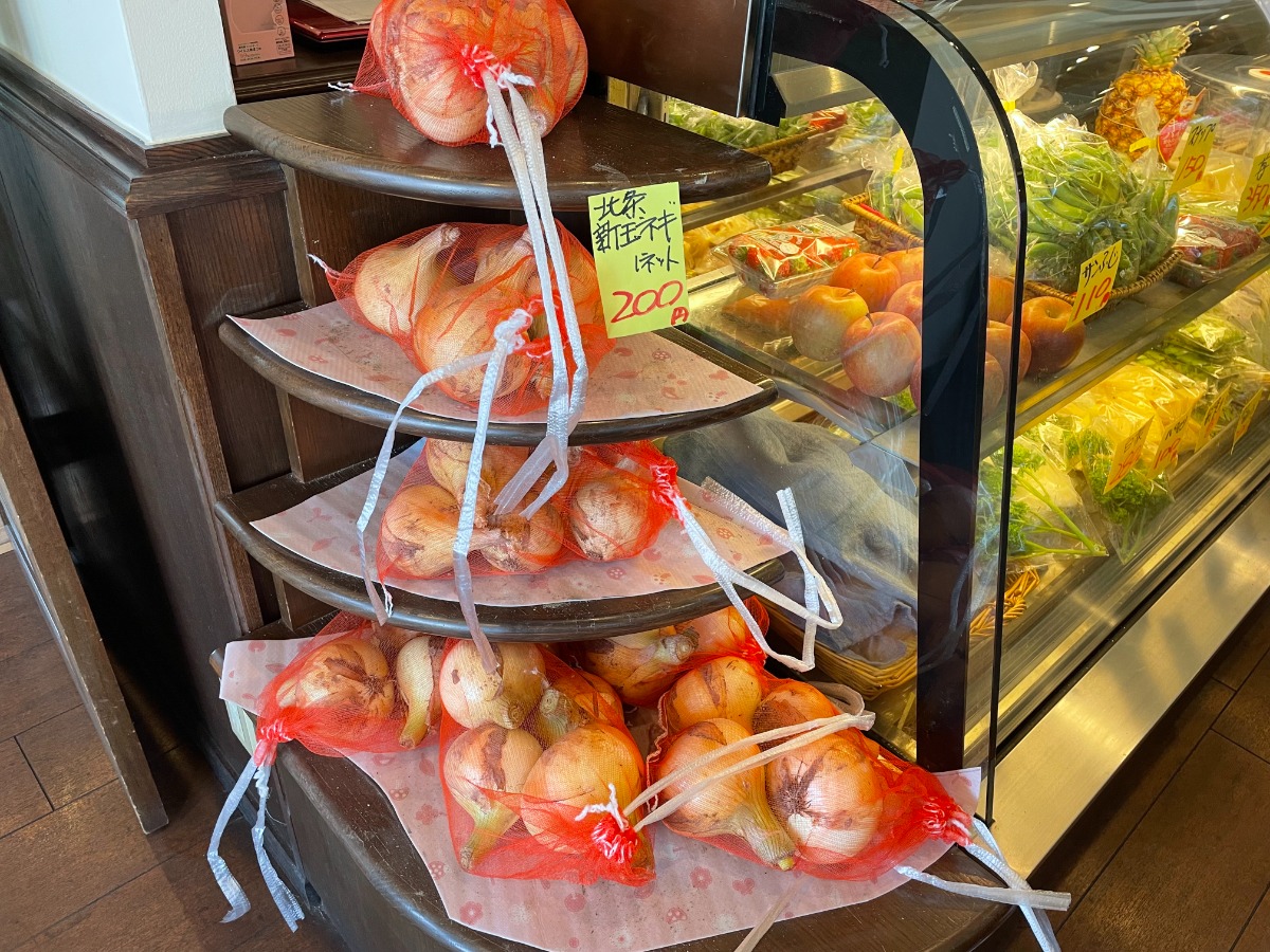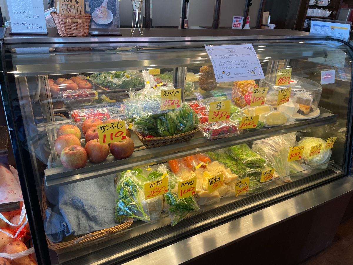 レジ横のショーケース内には地元産の野菜とフルーツが販売されていました。