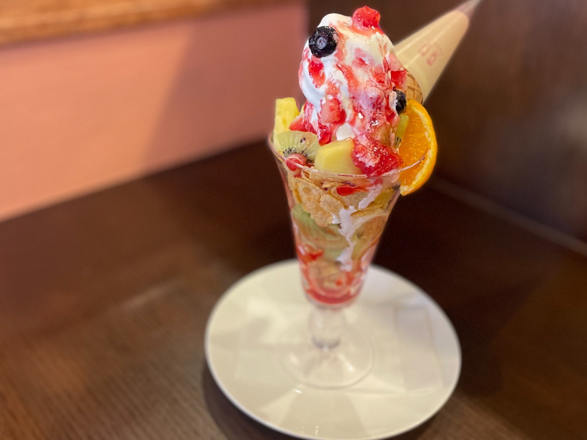 「フルーツパフェ」は数種類の彩りフルーツがトッピングされており、底に眠る自家製ワッフルはふんわり柔らか。コーンフレークや生クリームなど、食べ進めるごとに食感の違いを楽しめる大満足な内容です。