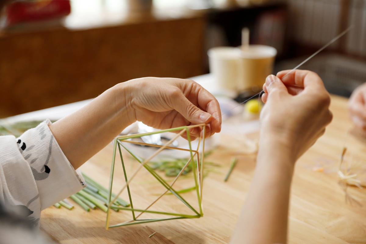 特殊な針を使ってカットした麦わらに糸を通し、幾何学的な形を作っていきます。
