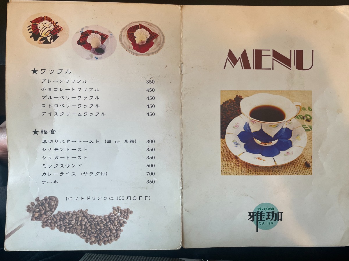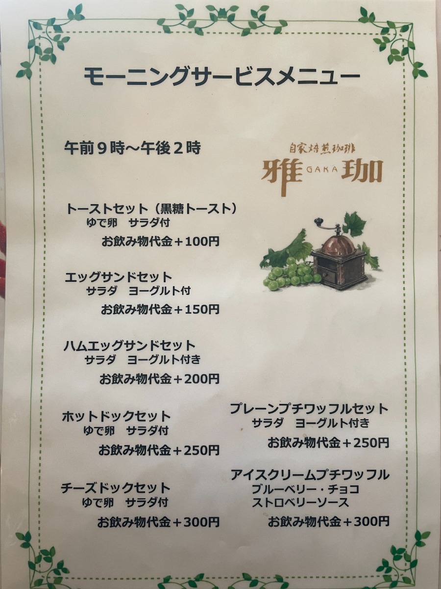 雅珈で欠かせないのは、季節限定で提供されるフルーツを贅沢に使ったワッフル・パフェや、お得なモーニングセット!
