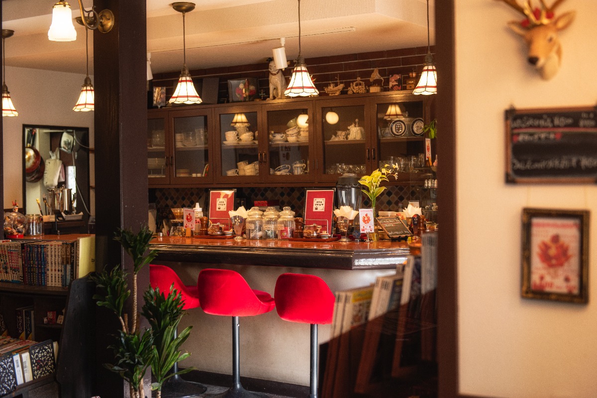 長年、地元の人たちに愛され営業していた純喫茶が閉店して、しばらくそのままだった店を全面改装。いつか純喫茶を開くのが夢だった店主は、あえてレトロな赤いビロードの椅子やソファをオーダー。壁をレンガで敷き詰め、こだわって集めたアンティークのインテリアや雑貨で飾った店内はまるで昭和そのもの。